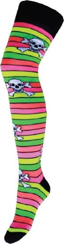 Stylische Gothic & Punk Overknees Strümpfe - Multi Colour Stripes & Skulls Feature